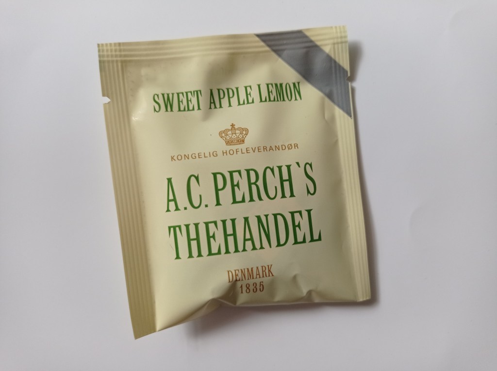 Et aujourd’hui je vous fais découvrir le « Sweet Apple & Lemon » de la A.C Perch’s Thehandel une maison de thé danoise. C’est un thé noir avec de l’hibiscus, des morceaux de pomme, du citron, orange, … et arôme de bergamote et de coing…
