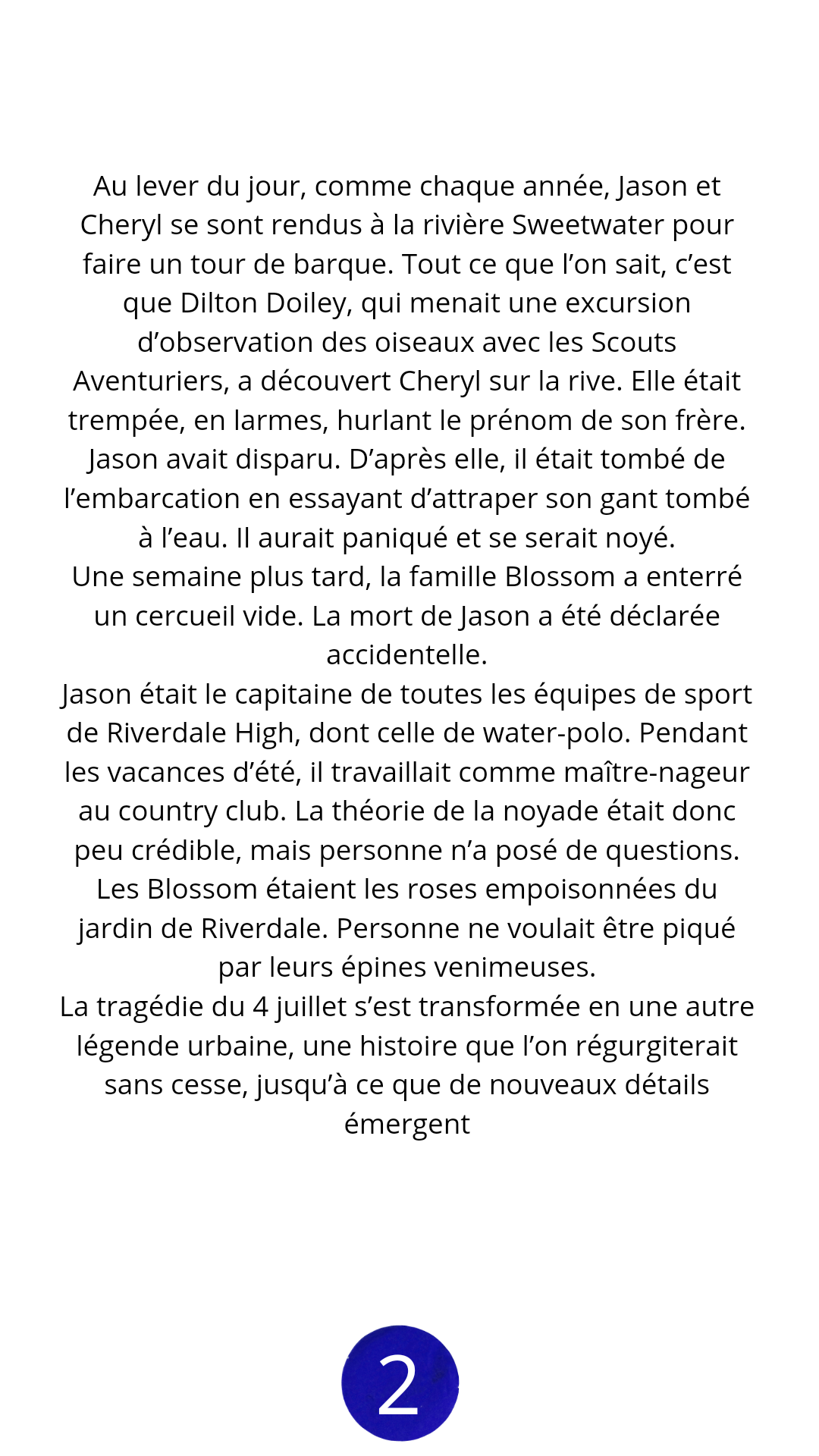 Ce matin-là à l’aube, un coup de feu retentit du côté de la rivière Sweetwater, bouleversant la paisible bourgade de RIVERDALE. Mais à quoi ressemblait la vie des habitants avant ce terrible événement ?